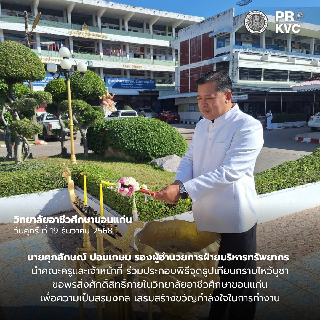 ดร.สิริรัชนา เนาส์โสภา ผู้อำนวยการวิทยาลัยอาชีวศึกษาขอนแก่น ได้มอบหมายให้ นายศุภลักษณ์ ปอนเกษม รองผู้อำนวยการฝ่ายบริหารทรัพยากร นำคณะครูและเจ้าหน้าที่ ร่วมประกอบพิธีจุดธูปเทียนกราบไหว้บูชาขอพร พระพุทธประทานพร พระพิฆเณศวร และกราบไหว้บูชาขอพร พระภูมิชัยมงคลและศาลเจ้าปู่เจ้าย่า ภายในวิทยาลัยอาชีวศึกษาขอนแก่น