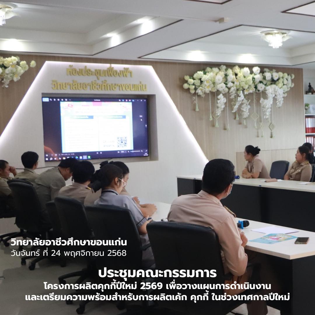 ดร.สิริรัชนา เนาว์โสภา ผู้อำนวยการวิทยาลัยอาชีวศึกษาขอนแก่น ได้มอบหมายให้นายยงยุทธ นันดี รองผู้อำนวยการฝ่ายแผนงานและความร่วมมือ จัดประชุมคณะกรรมการ โครงการผลิตเค้กคุกกี้ปีใหม่ 2569 เพื่อวางแผนการดำเนินงาน และเตรียมความพร้อมสำหรับการผลิตเค้กคุกกี้ในช่วงเทศกาลปีใหม่