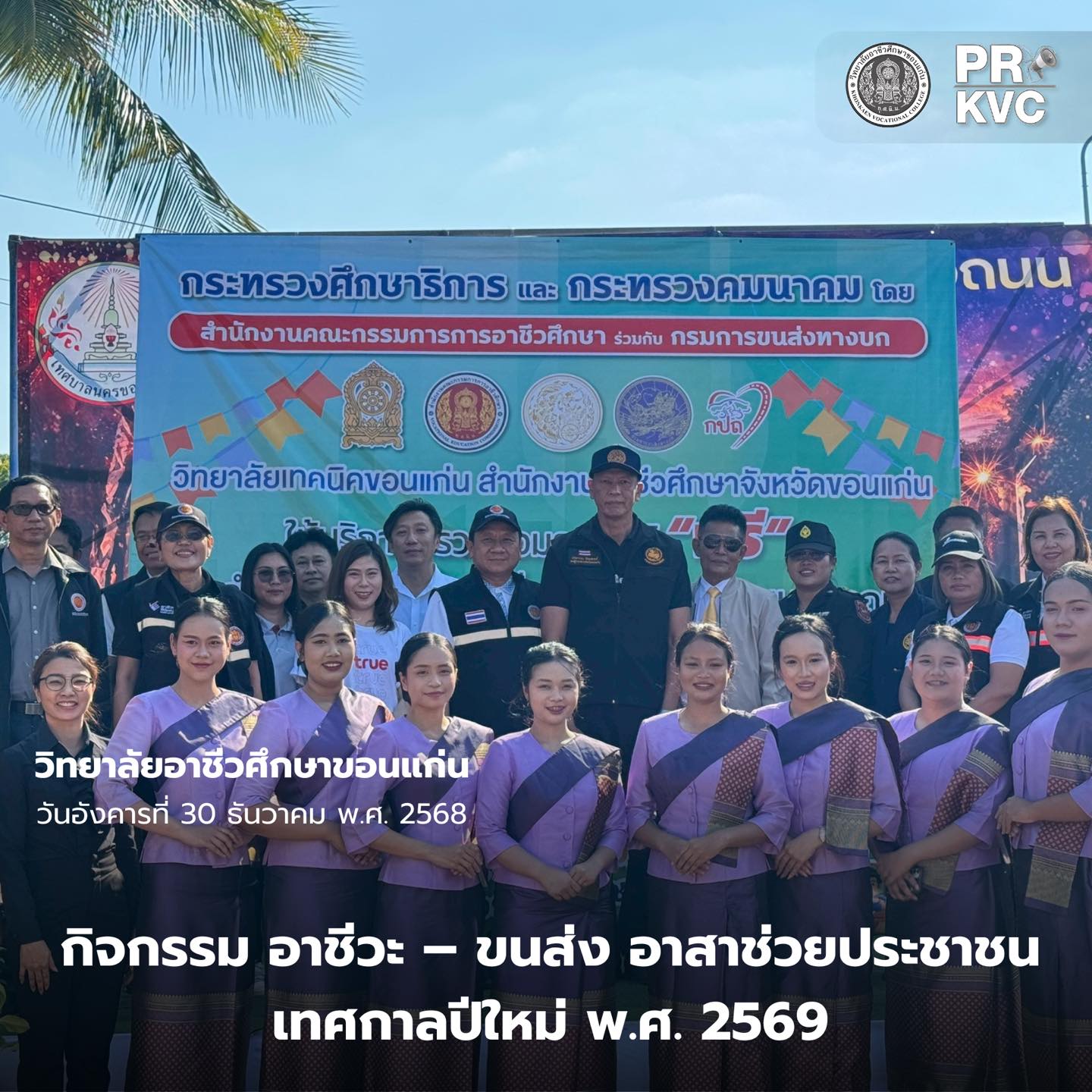 ดร.สิริรัชนา เนาว์โสภา ผู้อำนวยการวิทยาลัยอาชีวศึกษาขอนแก่นนำคณะผู้บริหาร คณะครู และนักเรียน นักศึกษา เข้าร่วมพิธีเปิดกิจกรรม “อาชีวะ–ขนส่ง อาสาช่วยประชาชน เทศกาลปีใหม่ 2569” 🚗🎉