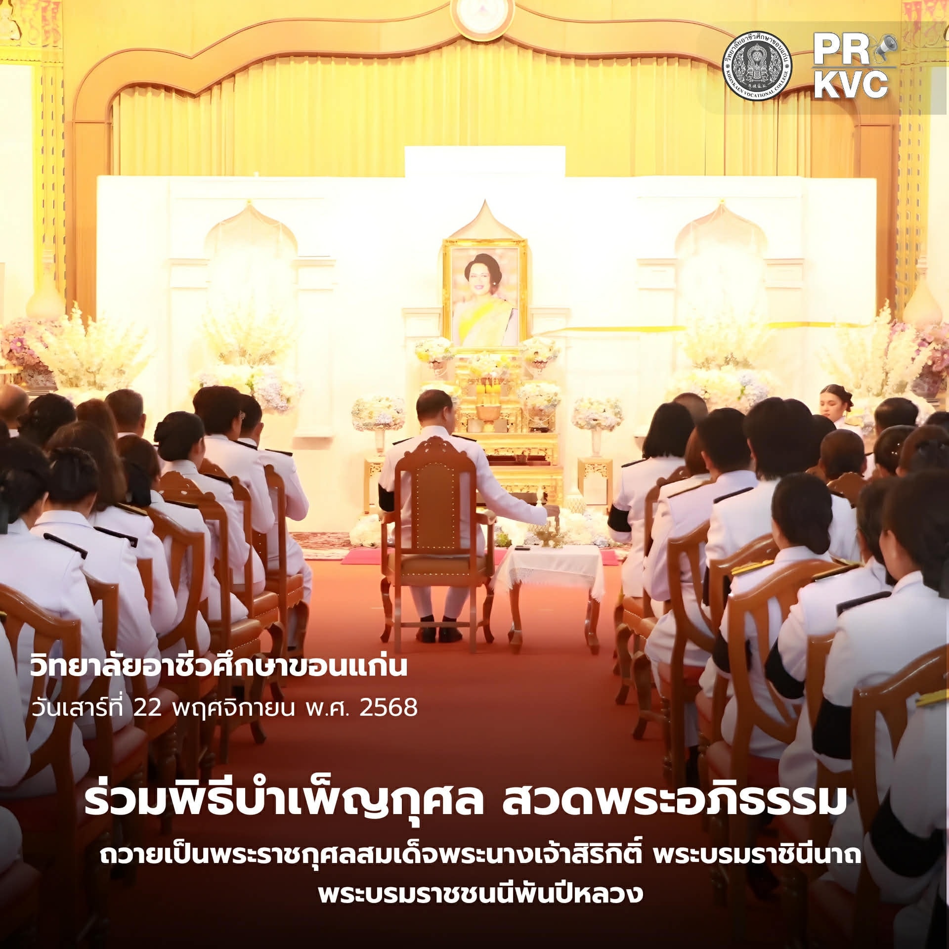 ดร.สิริรัชนา เนาว์โสภา ผู้อำนวยการวิทยาลัยอาชีวศึกษาขอนแก่น พร้อมด้วย นางอารีย์ มูลดามาตย์ รองผู้อำนวยการฝ่ายวิชาการ และคณะครู ร่วมพิธีบำเพ็ญกุศล สวดพระอภิธรรม ถวายเป็นพระราชกุศลสมเด็จพระนางเจ้าสิริกิติ์ พระบรมราชินีนาถ พระบรมราชชนนีพันปีหลวง ณ พระมหาธาตุแก่นนครอนุสรณ์สาธุชน วัดหนองแวงพระอารามหลวง อำเภอเมืองขอนแก่น จังหวัดขอนแก่น