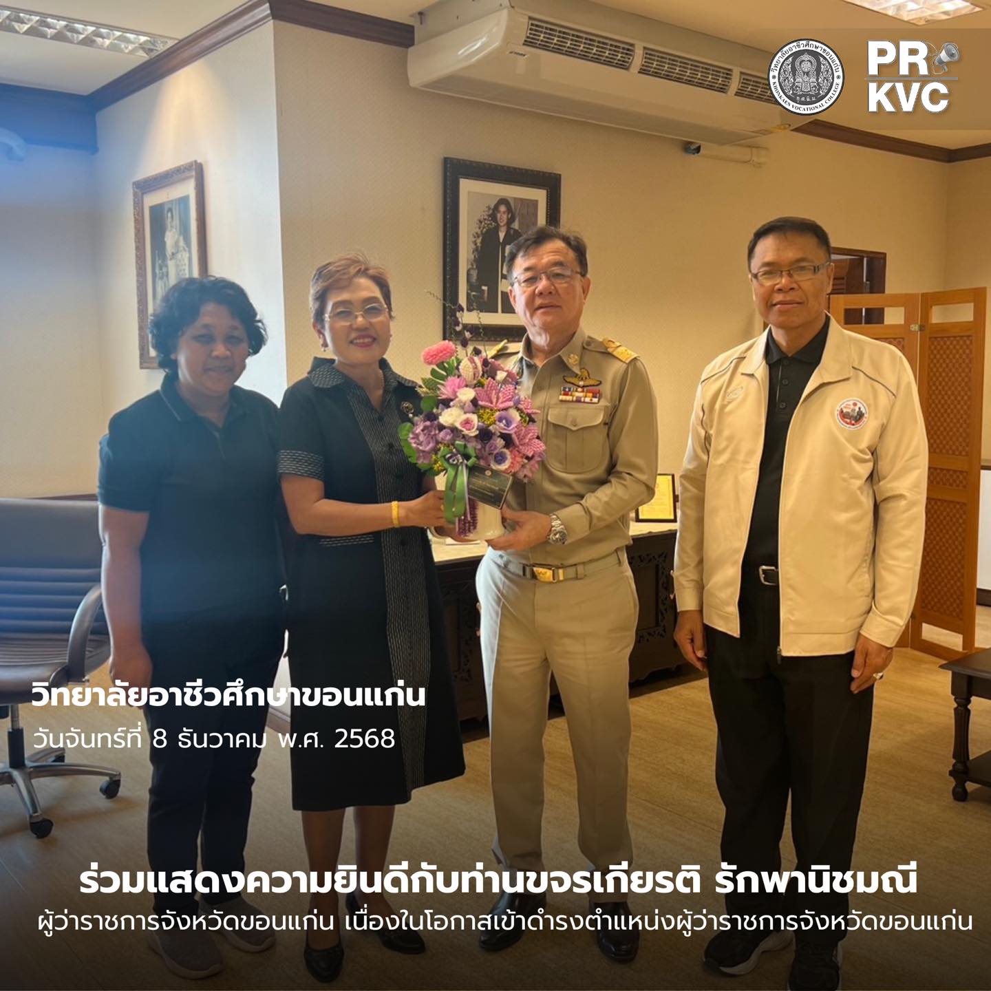 ดร.สิริรัชนา เนาว์โสภา ผู้อำนวยการวิทยาลัยอาชีวศึกษาขอนแก่น พร้อมด้วยคณะผู้บริหาร ร่วมแสดงความยินดีกับท่านขจรเกียรติ รักพานิชมณี ผู้ว่าราชการจังหวัดขอนแก่น เนื่องในโอกาสเข้าดำรงตำแหน่งผู้ว่าราชการจังหวัดขอนแก่น และได้เรียนเชิญเข้าร่วมกิจกรรม