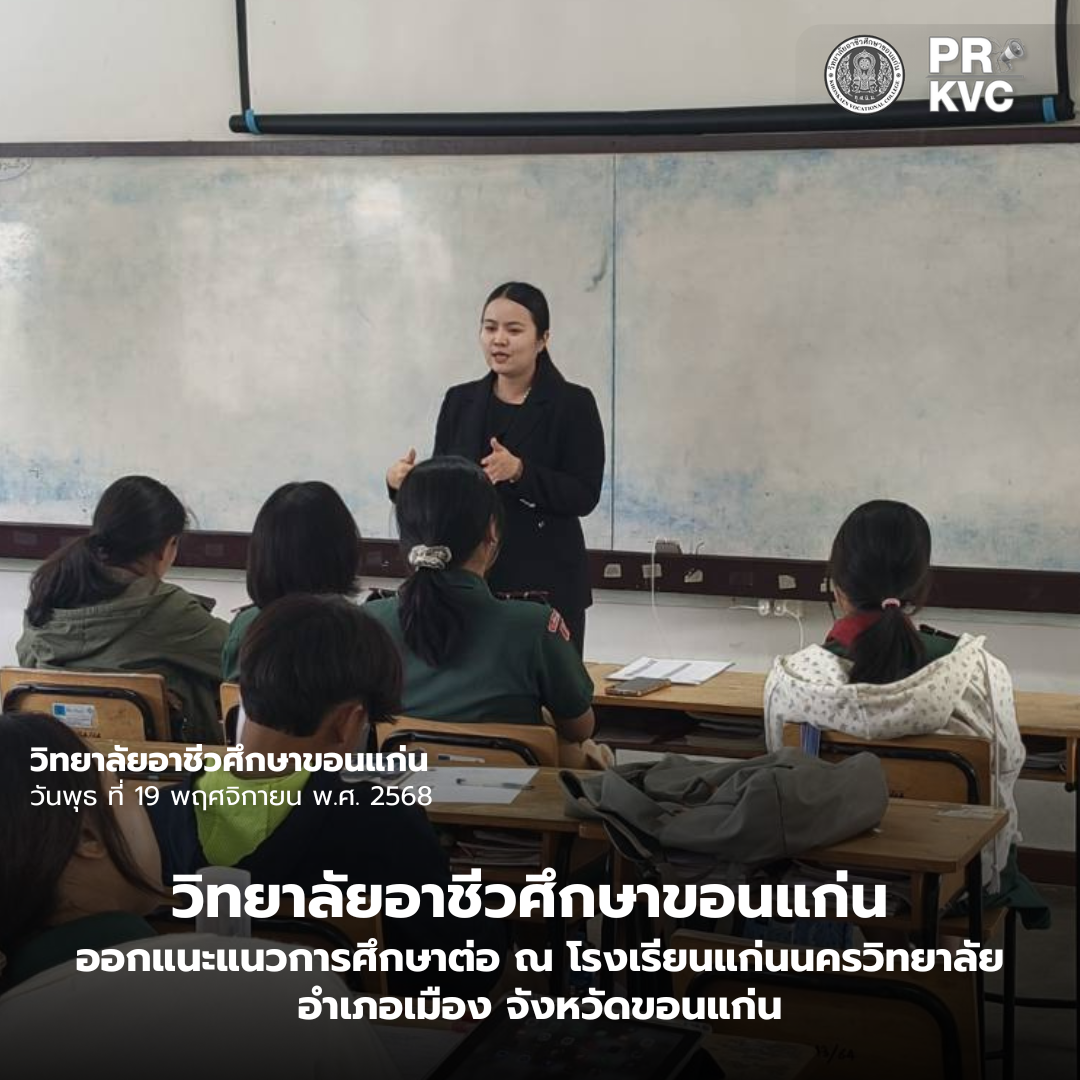 วิทยาลัยอาชีวศึกษาขอนแก่น นำคณะครูแนะแนว ออกแนะแนวการศึกษาต่อ ให้กับนักเรียนโรงเรียนแก่นนครวิทยาลัย เพื่อประชาสัมพันธ์หลักสูตรการเรียนการสอนทั้งระดับ ประกาศนียบัตรวิชาชีพ (ปวช.) และ ประกาศนียบัตรวิชาชีพชั้นสูง (ปวส.) พร้อมให้ข้อมูลด้านสาขาวิชาที่เปิดสอน อาชีพรองรับในอนาคต และโอกาสความก้าวหน้าในสายอาชีพ