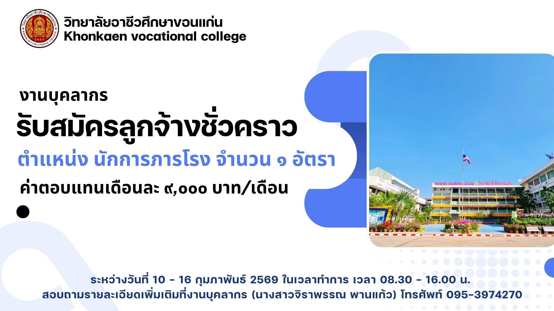 5. รับสมัครลูกจ้างชั่วคราว ตำแหน่ง นักการภารโรง จำนวน ๑ อัตรา