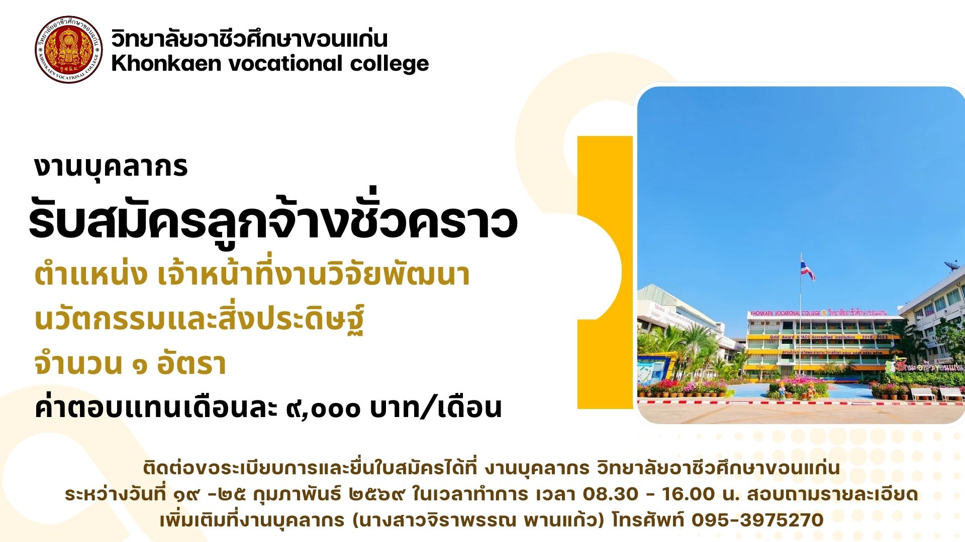 วิทยาลัยอาชีวศึกษาขอนแก่น ประกาศรับสมัคร นักเรียน นักศึกษา ประจำปีการศึกษา 2568 |     ขอเชิญร่วมงาน การประกวดสิ่งประดิษฐ์ของคนรุ่นใหม่ กลุ่มจังหวัดขอนแก่น ประจำปีการศึกษา 2568 ระหว่างวันที่ 19-20 พฤศจิกายน 2568 ณ วิทยาลัยอาชีวศึกษาขอนแก่น |