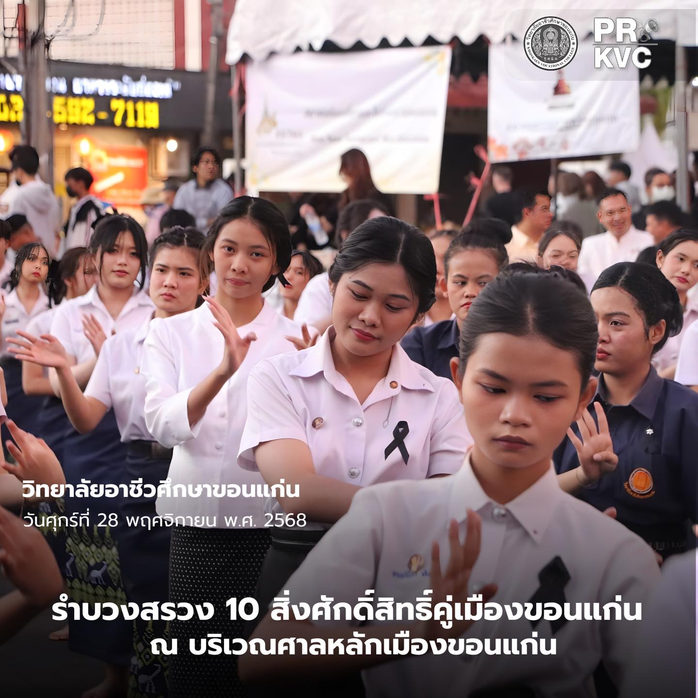 นำโดย ดร.สิริรัชนา เนาว์โสภา ผู้อำนวยการวิทยาลัยอาชีวศึกษาขอนแก่น นำคณะผู้บริหาร ครู บุคลากร และนักเรียน นักศึกษา กว่า 1,500 คน ร่วมแปรอักษรและรำบวงสรวง 10 สิ่งศักดิ์สิทธิ์คู่เมืองขอนแก่น อย่างยิ่งใหญ่และงดงาม เนื่องใน งานเทศกาลไหมนานาชาติ ประเพณีผูกเสี่ยว และงานกาชาดจังหวัดขอนแก่น ประจำปี 2568
