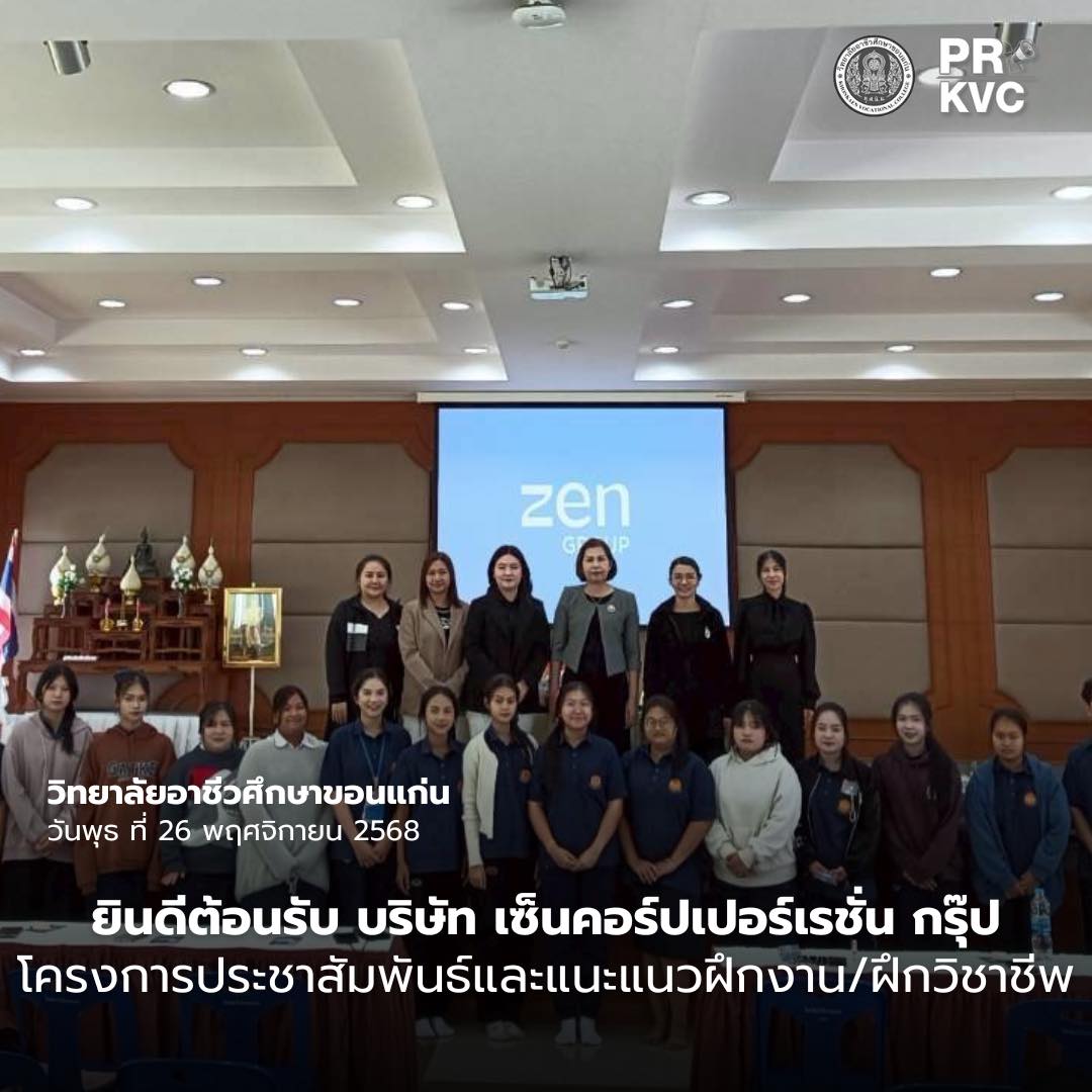 ดร.สิริรัชนา เนาว์โสภา ผู้อำนวยการวิทยาลัยอาชีวศึกษาขอนแก่น มอบหมายให้ นางอารีย์ มูลดามาตย์ รองผู้อำนวยการฝ่ายวิชาการ พร้อมด้วยคณะครู ร่วมให้การต้อนรับ บริษัท เซ็นคอร์ปเปอร์เรชั่น กรุ๊ป ในโครงการประชาสัมพันธ์และแนะแนว รับนักศึกษาเข้าฝึกงาน/ฝึกวิชาชีพ