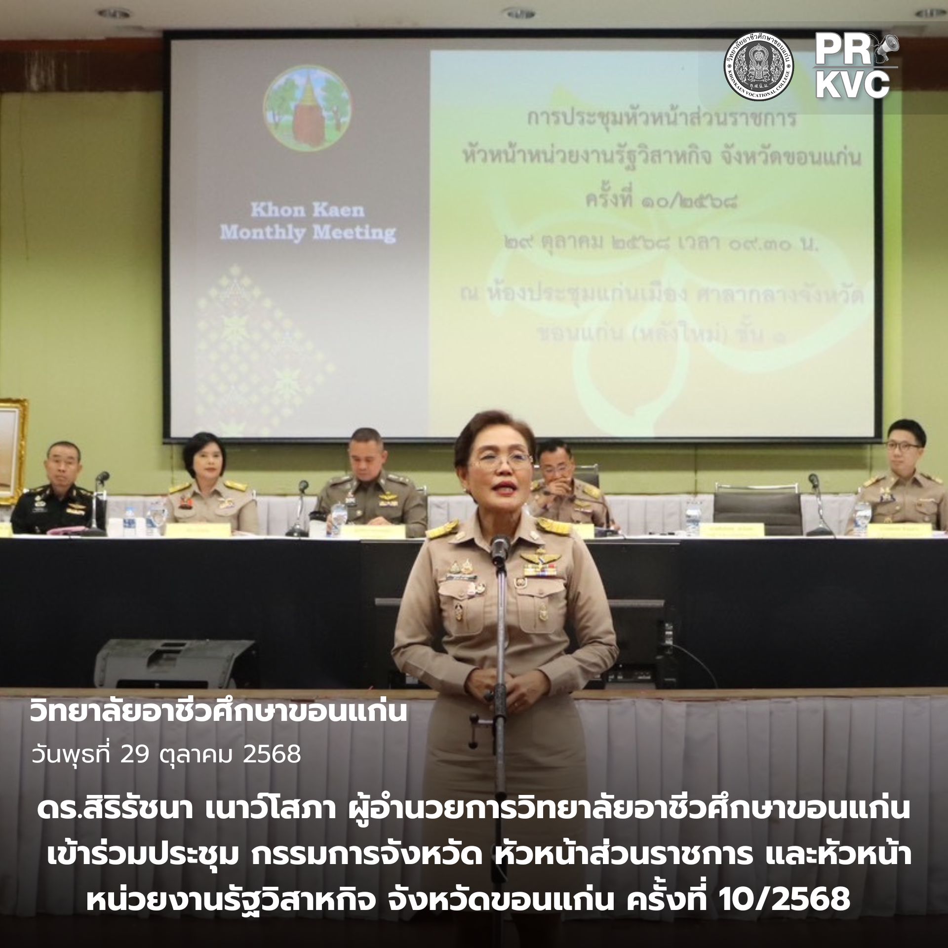 ดร.สิริรัชนา เนาว์โสภา ผู้อำนวยการวิทยาลัยอาชีวศึกษาขอนแก่น เข้าร่วมประชุม กรรมการจังหวัด หัวหน้าส่วนราชการ และหัวหน้าหน่วยงานรัฐวิสาหกิจ จังหวัดขอนแก่น ครั้งที่ 10/2568
