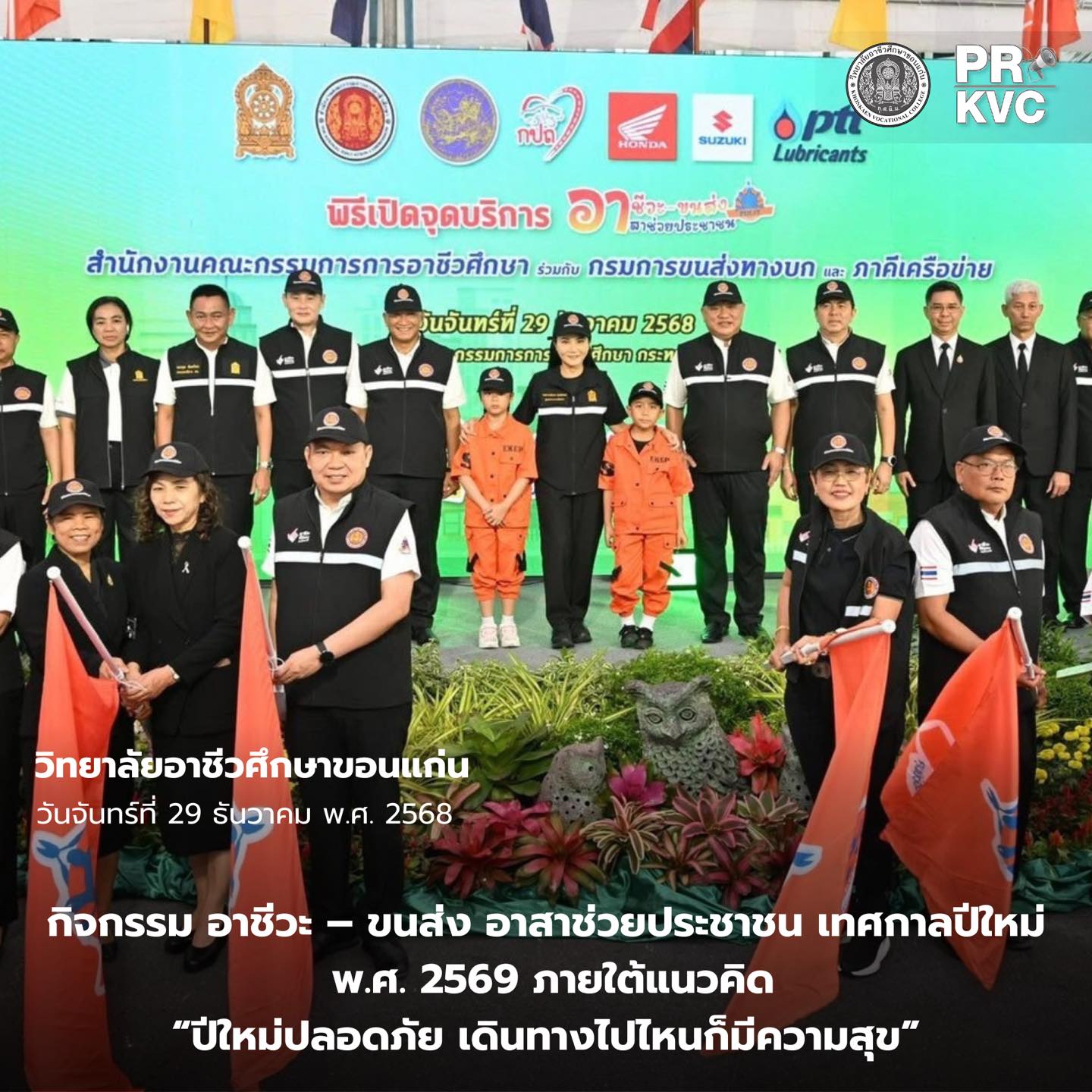 ดร.สิริรัชนา เนาว์โสภา ผู้อำนวยการวิทยาลัยอาชีวศึกษาขอนแก่น พร้อมด้วย นายยงยุทธ นันดี รองผู้อำนวยการฝ่ายแผนงานและความร่วมมือ เข้าร่วมพิธีเปิดกิจกรรม อาชีวะ – ขนส่ง อาสาช่วยประชาชน เทศกาลปีใหม่ พ.ศ. 2569 ภายใต้แนวคิด