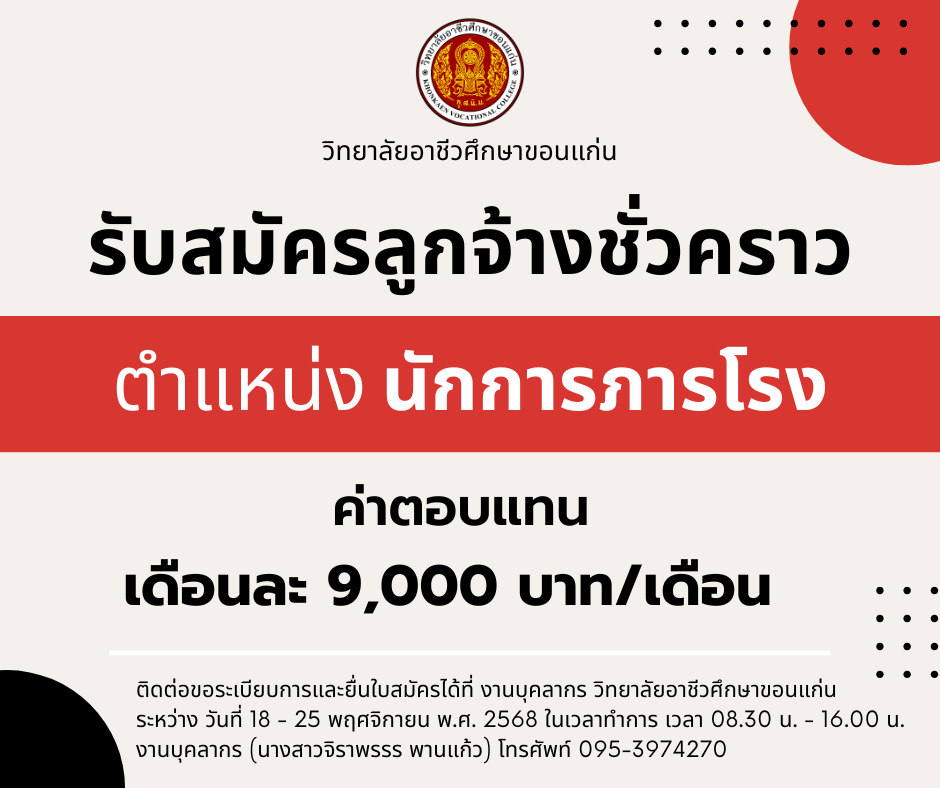 ติดต่อขอระเบียบการและยื่นใบสมัครได้ที่ งานบุคลากร วิทยาลัยอาชีวศึกษาขอนแก่น
