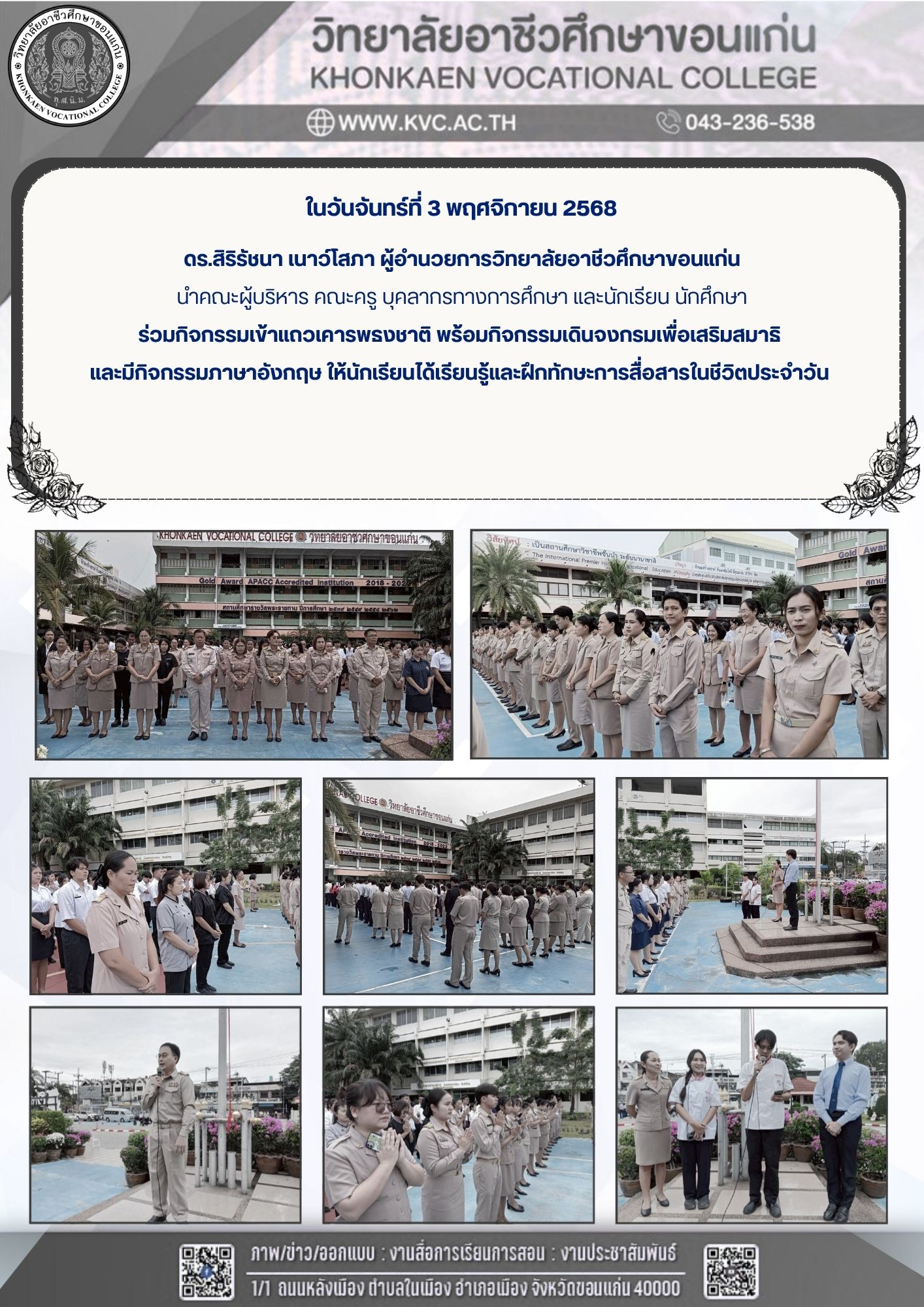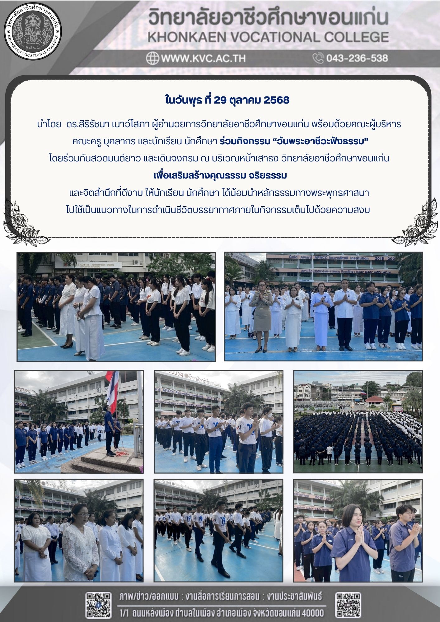 กิจกรรม “วันพระอาชีวะฟังธรรม” โดยร่วมกันสวดมนต์ยาว และเดินจงกรม ณ บริเวณหน้าเสาธง วิทยาลัยอาชีวศึกษาขอนแก่น