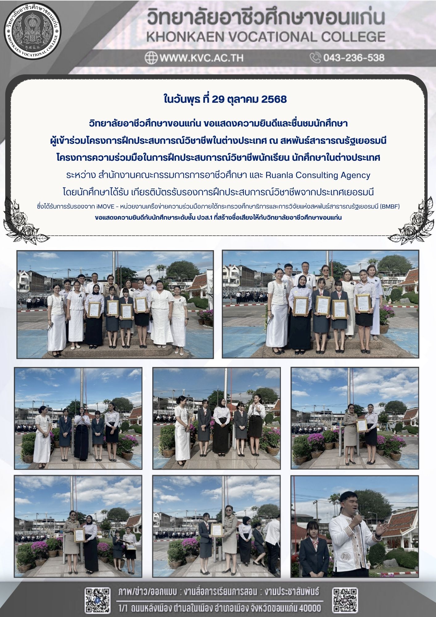 วิทยาลัยอาชีวศึกษาขอนแก่น ขอแสดงความยินดีและชื่นชมนักศึกษาผู้เข้าร่วมโครงการฝึกประสบการณ์วิชาชีพในต่างประเทศ ณ สหพันธ์สาธารณรัฐเยอรมนี