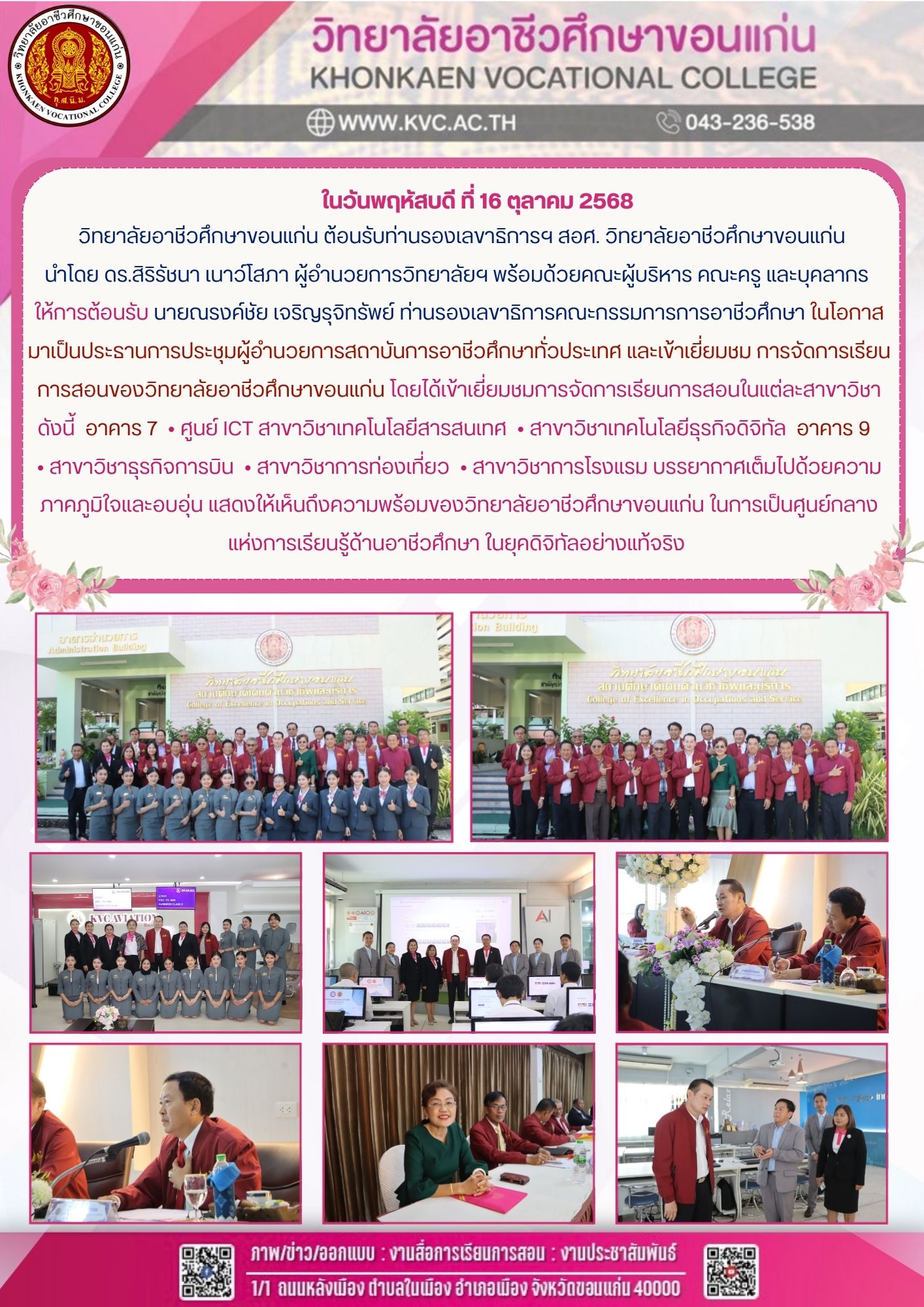 วิทยาลัยอาชีวศึกษาขอนแก่น ต้อนรับท่านรองเลขาธิการฯ สอศ. วิทยาลัยอาชีวศึกษาขอนแก่น นำโดย ดร.สิริรัชนา เนาว์โสภา ผู้อำนวยการวิทยาลัยฯ พร้อมด้วยคณะผู้บริหาร คณะครู และบุคลากร