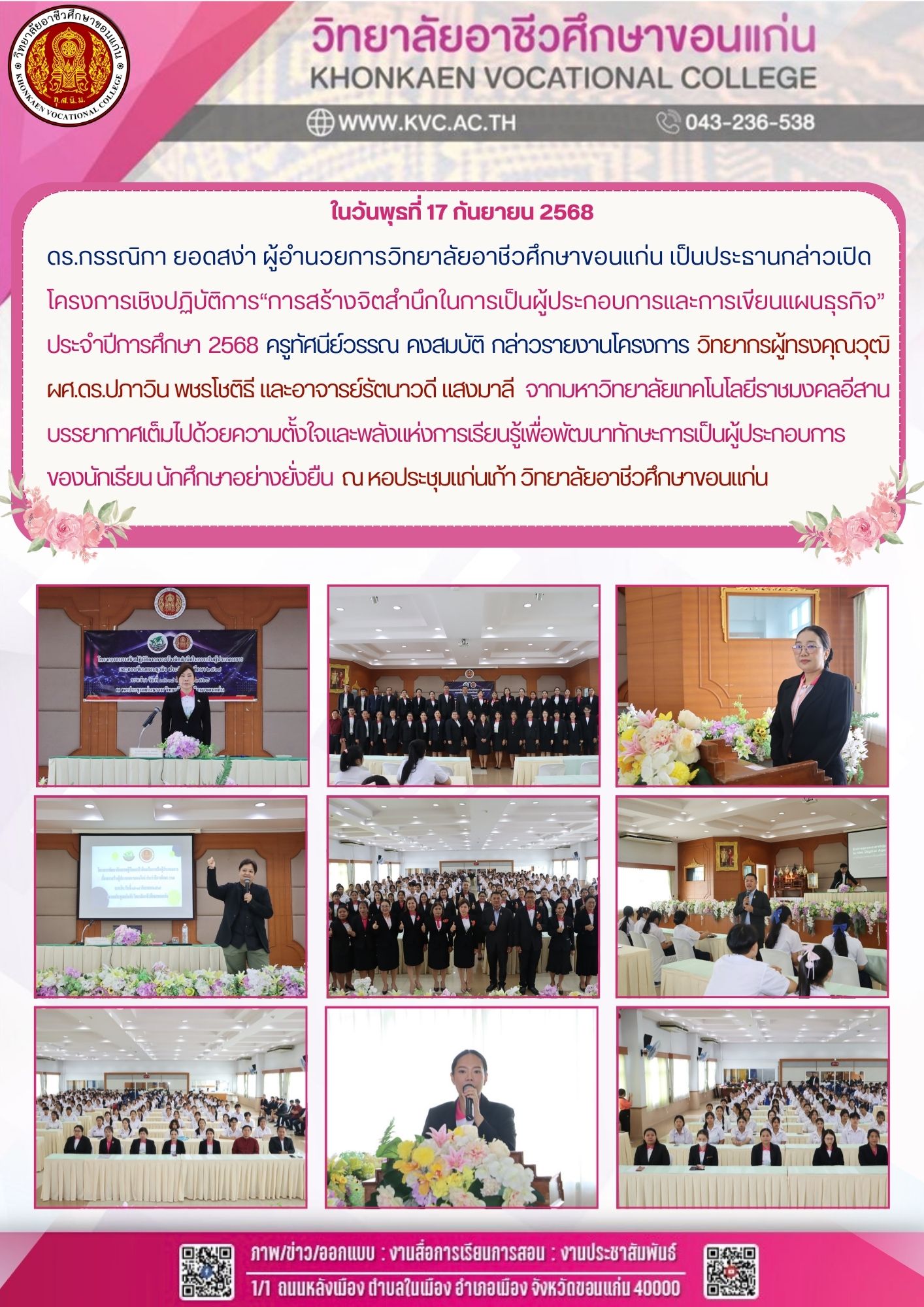 ในวันพุธที่ 17 กันยายน 2568 ดร.กรรณิกา ยอดสง่า ผู้อำนวยการวิทยาลัยอาชีวศึกษาขอนแก่น เป็นประธานกล่าวเปิด โครงการเชิงปฏิบัติการ“การสร้างจิตสำนึกในการเป็นผู้ประกอบการและการเขียนแผนธุรกิจ” ประจำปีการศึกษา 2568 ครูทัศนีย์วรรณ คงสมบัติ กล่าวรายงานโครงการ วิทยากรผู้ทรงคุณวุฒิ ผศ.ดร.ปภาวิน พชรโชติธี และอาจารย์รัตนาวดี แสงมาลี จากมหาวิทยาลัยเทคโนโลยีราชมงคลอีสาน บรรยากาศเต็มไปด้วยความตั้งใจและพลังแห่งการเรียนรู้เพื่อพัฒนาทักษะการเป็นผู้ประกอบการของนักเรียน นักศึกษาอย่างยั่งยืน ณ หอประชุมแก่นเก้า วิทยาลัยอาชีวศึกษาขอนแก่น