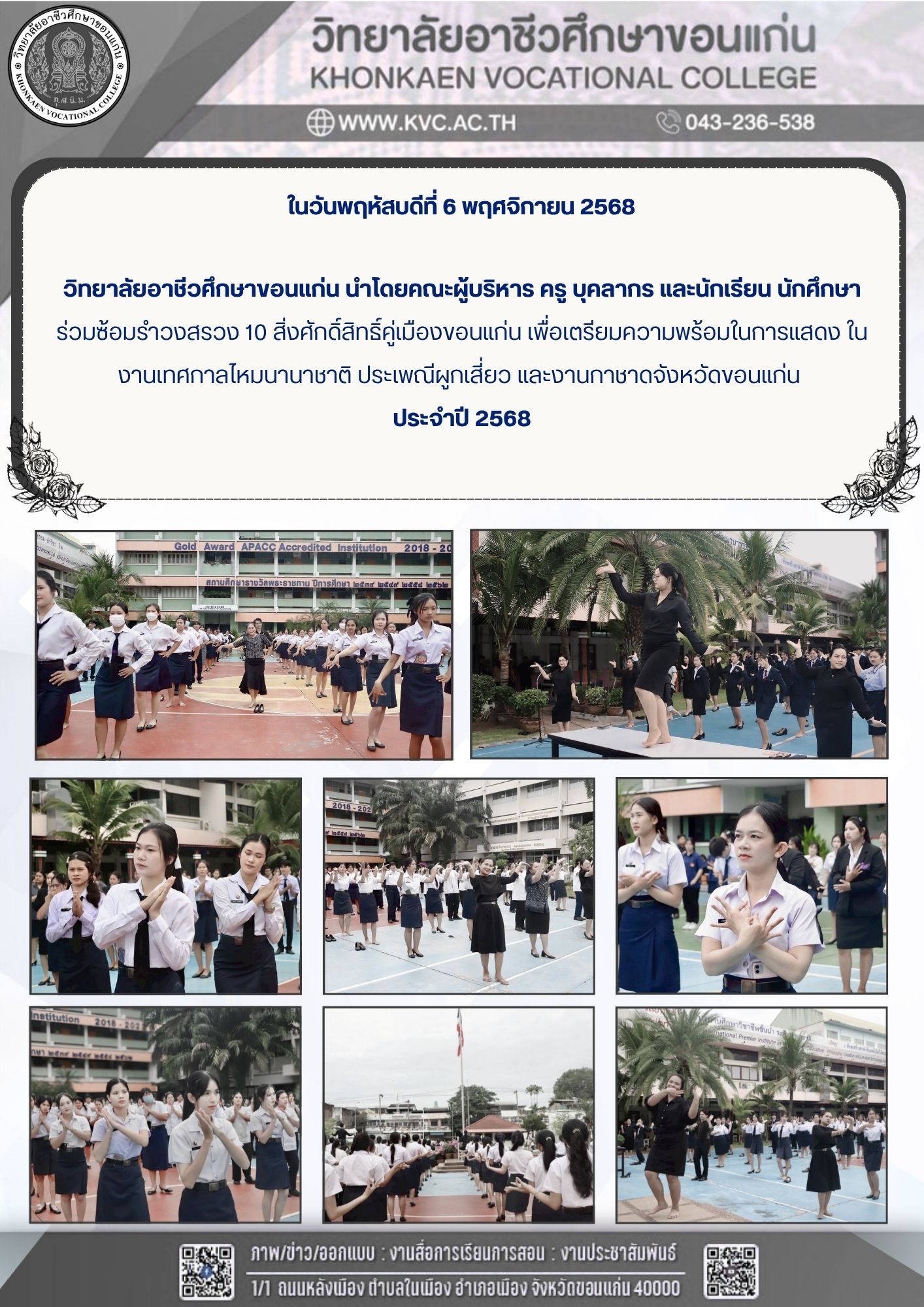 ✨วิทยาลัยอาชีวศึกษาขอนแก่น นำโดยคณะผู้บริหาร ครู บุคลากร และนักเรียน นักศึกษา ร่วมซ้อมรำบวงสรวง 10 สิ่งศักดิ์สิทธิ์คู่เมืองขอนแก่น เพื่อเตรียมความพร้อมในการแสดง ในงานเทศกาลไหมนานาชาติ ประเพณีผูกเสี่ยว และงานกาชาดจังหวัดขอนแก่น ประจำปี 2568 #วิทยาลัยอาชีวศึกษาขอนแก่น #รำวงสรวง10สิ่งศักดิ์สิทธิ์คู่เมืองขอนแก่น #เรียนดีมีคุณธรรม #เรียนดีมีงานทำ #สืบสานวัฒนธรรมท้องถิ่น #อาชีวะขอนแก่นร่วมใจ #kvc #prkvc
